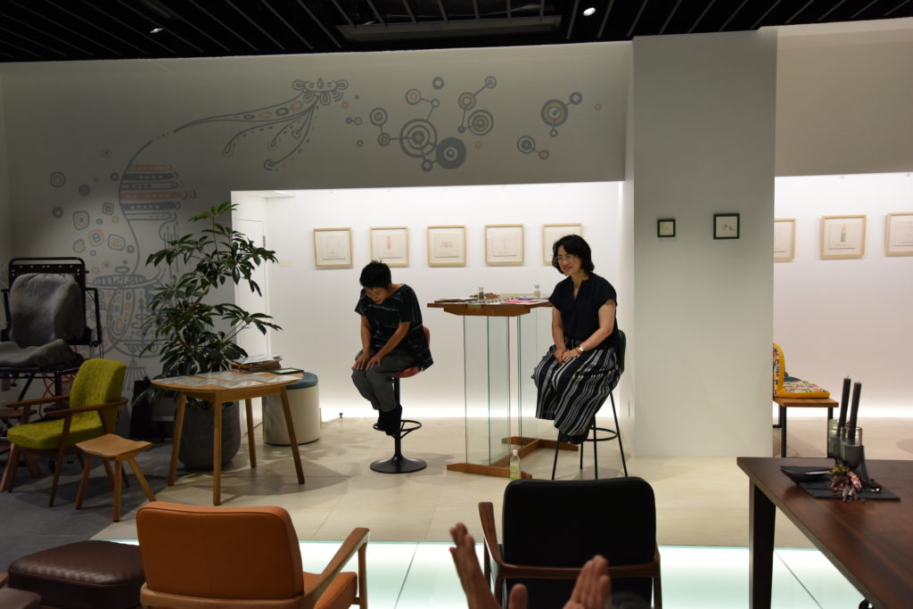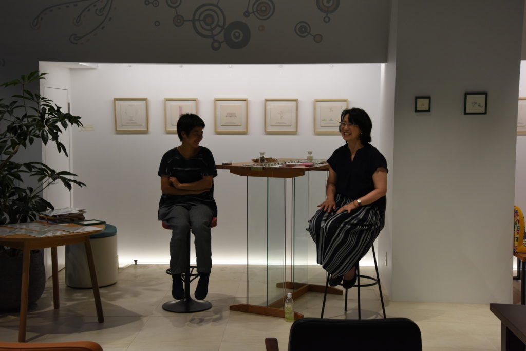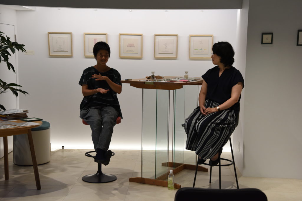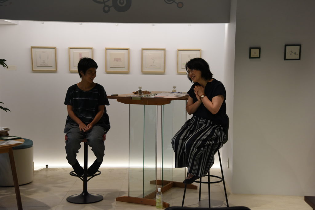 今回の対談のお相手は、イタリア在住でヨーロッパを拠点として、活躍するアーティスト工藤あゆみさん。日本で出版されている作品集「はかれないものをはかる」(青幻舎)を中心に心に響く言葉と独特のタッチで描かれた作品をP!NTO SEATING DEZIGNにて展示。店内はあゆみさんの作品とP!NTOの椅子が心地よく響き合った。それぞれの作品が生まれた背景にはどんなストーリーがあるのか知りたくて、展示中にトークショーを開催し、話を伺った。