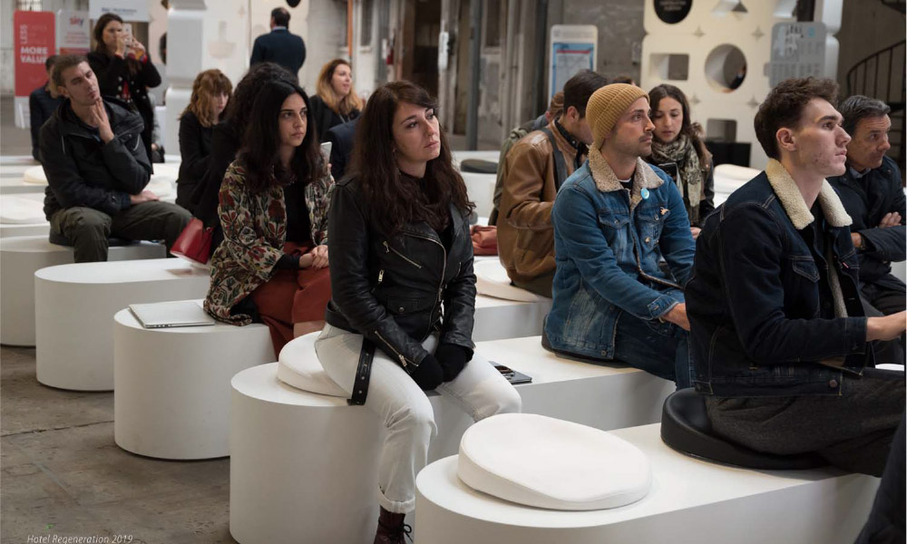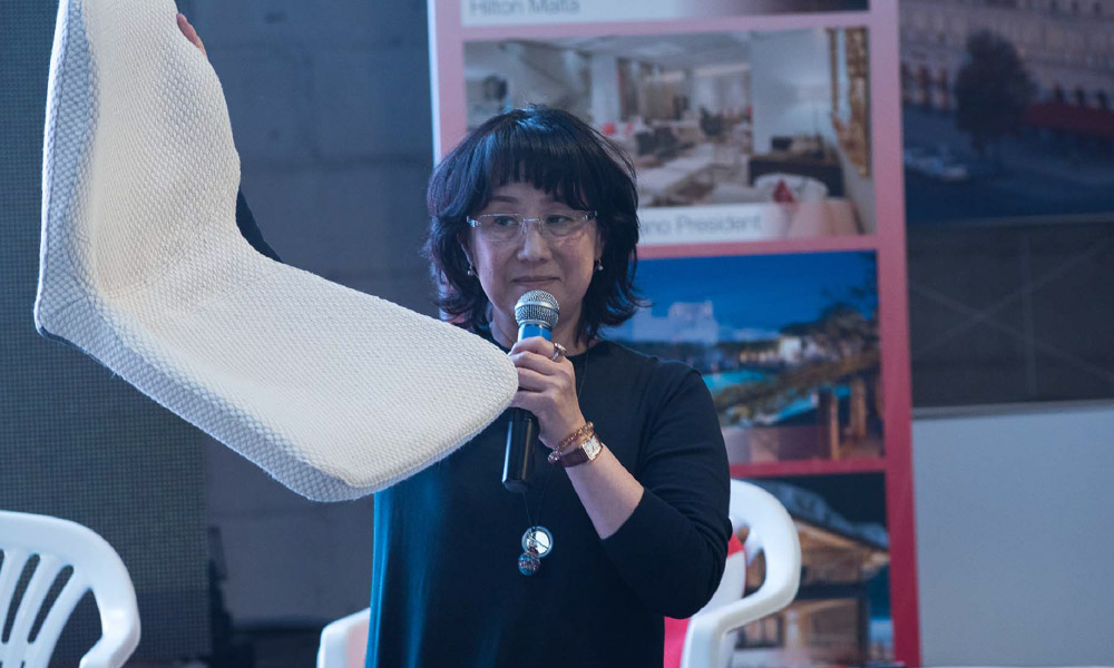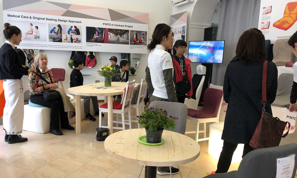 また、ホテルをはじめとするコントラクト・プロジェクトで国際的に活躍するイタリア人デザイナー、シモーネ・ミケーリ氏の広大な展示会場「Hotel Regeneration」にてTORONCO UOVO 新作POUFがあちこちに並べられ、展示会カンファレンスエリアにて、ピントの独自立体採型技術を紹介する、デモンストレーションイベントも開催させていただきました。