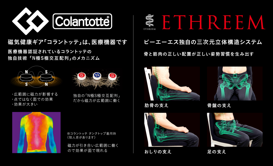 “p!nto (ピント)/正しい姿勢×colantotte (コラントッテ)/磁気の力”で血行を改善しコリの解消をサポート