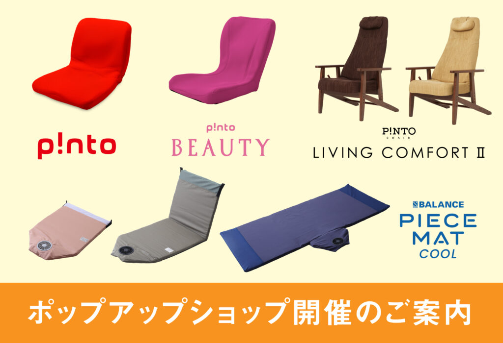 取り扱い商品は、「p!nto」「p!nto beauty」「ピースマットCOOL」「ピントチェアリビングコンフォートⅡ」など普段関西でお試しいただけない商品も豊富にご用意しております。